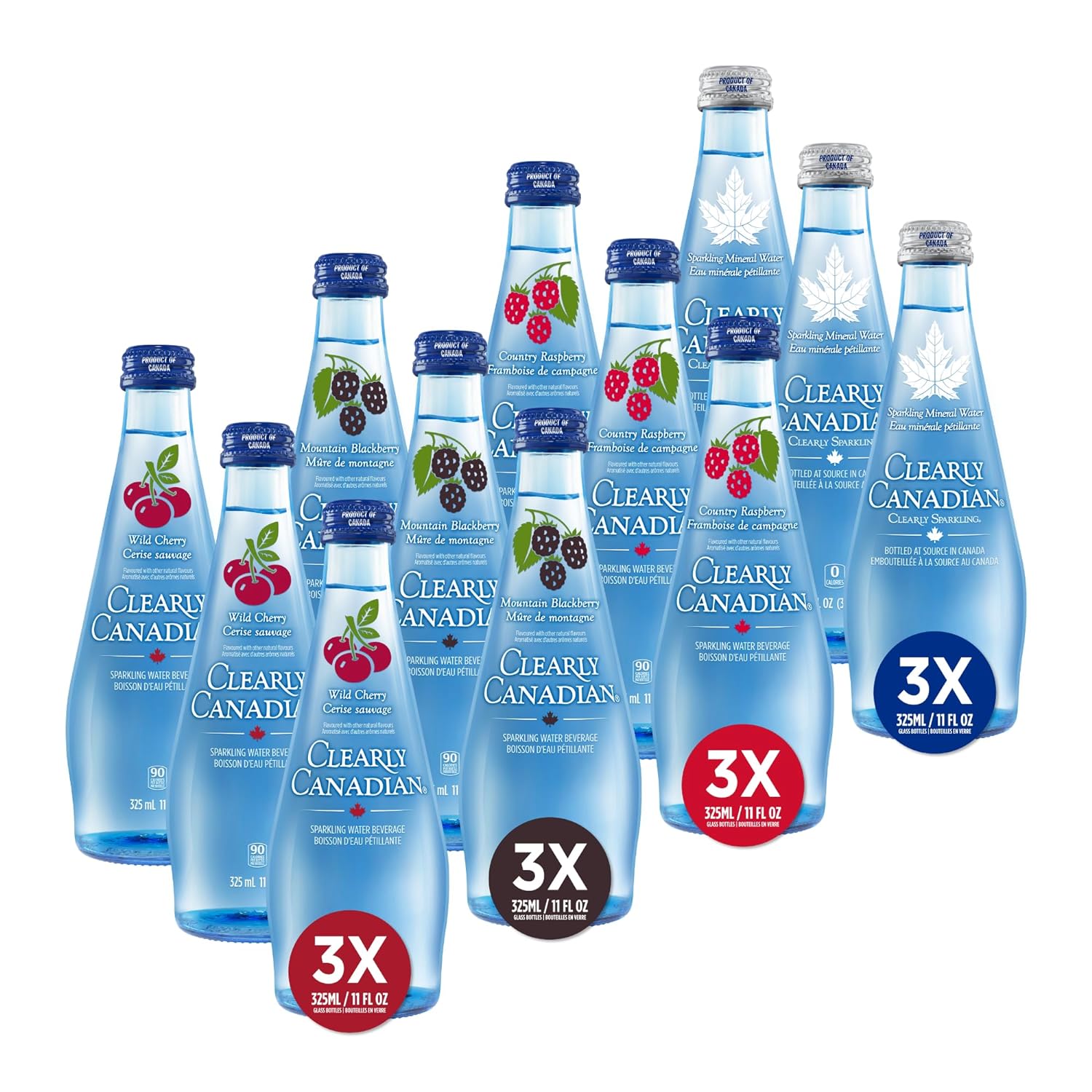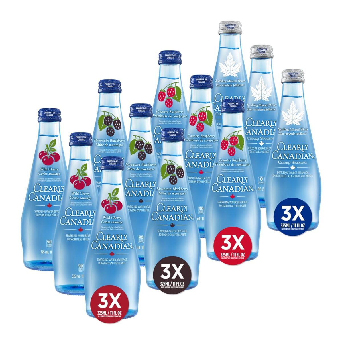 Clearly Canadian Variety Pack Sparkling Spring Water Beverage, Natural & Carbonated, Flavored Seltzer Water, Mixed Flavors, 1 Case (12 Bottles x 325mL)